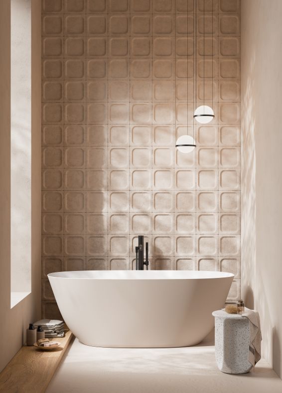 Freistehende Badewanne aus Solid Surface mit mineralischen Füllstoffen, hauptsächlich Aluminiumtrihydrat. Vereint technologische Innovation mit ästhetischer Verfeinerung. Hygienisch, langlebig und leicht verarbeitbar für komplexe Formen.