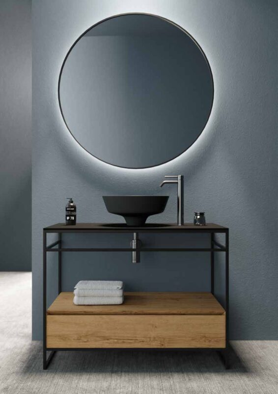 Waschbecken-Kollektion mit pulverbeschichteter Edelstahlstruktur, erhältlich mit Keramikplatte oder lackierter Schublade. Halbkreisförmiges Becken in weichem Parallelepiped mit abgerundeten Kanten.
