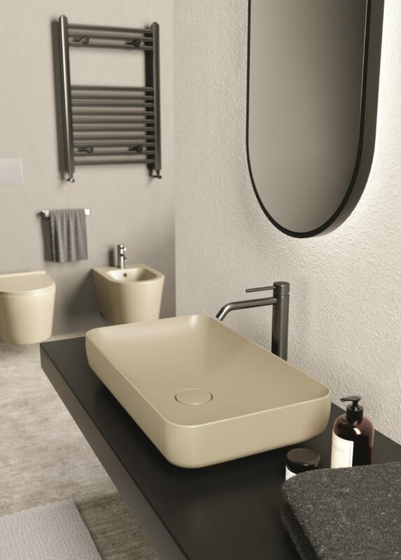 Serie ebenfalls verfügbar in verschiedenen Farben, Formen und Größen und komplettierbar mit WC und Bidet.