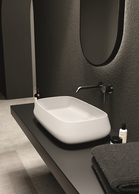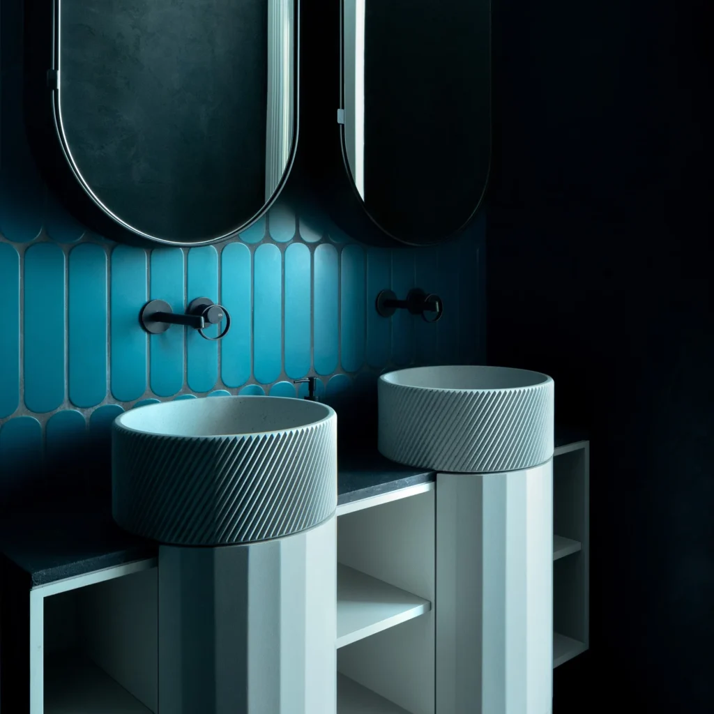 Waschbecken in perfekter Synthese von Linien und Volumen. Drei Waschbecken mit harmonischen Kurven zwischen Ästhetik und Eleganz, konzipiert für anspruchsvolle und raffinierte Umgebungen.