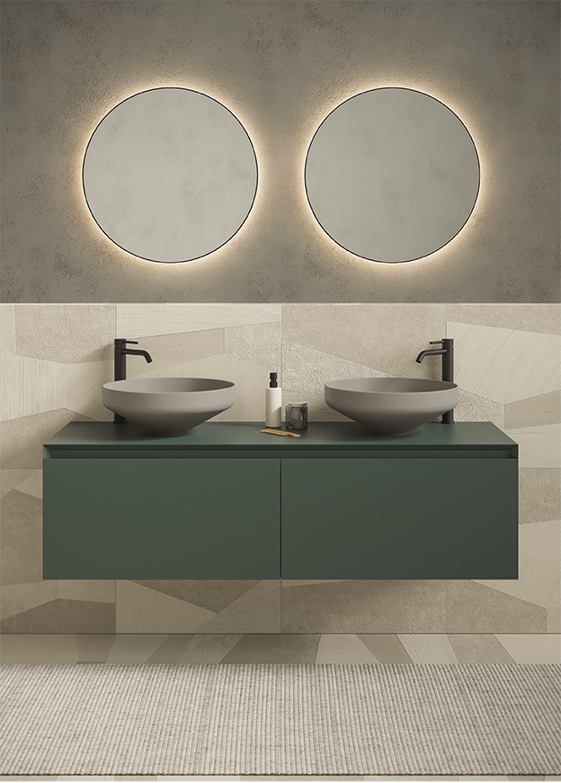 Evo 21 ist ein herausragendes System, das durch seine Konfigurierbarkeit und die Vielfalt an verfügbaren Oberflächen und Materialien besticht. Von Holz über Cristalplant bis hin zu Marmor, Naturstein oder sogar Leder bietet es eine breite Palette an Auswahlmöglichkeiten. Ob als Doppel- oder Einzelwaschtisch, als Aufsatz- oder eingelassenes Modell – Evo 21 ist wunderschön und elegant gestaltet und erfüllt jeden Wunsch.