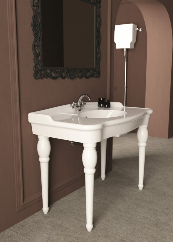 Großes Waschbecken mit praktischer Platte ist charakteristisch für diese Serie. Verfügbar ist die Serie in 16 verschiedenen Farben. Das Gestell, verfügbar in mattschwarz, bronze gebürstet oder Titan, kann um eine Schublade aus Holz ergänzt werden.