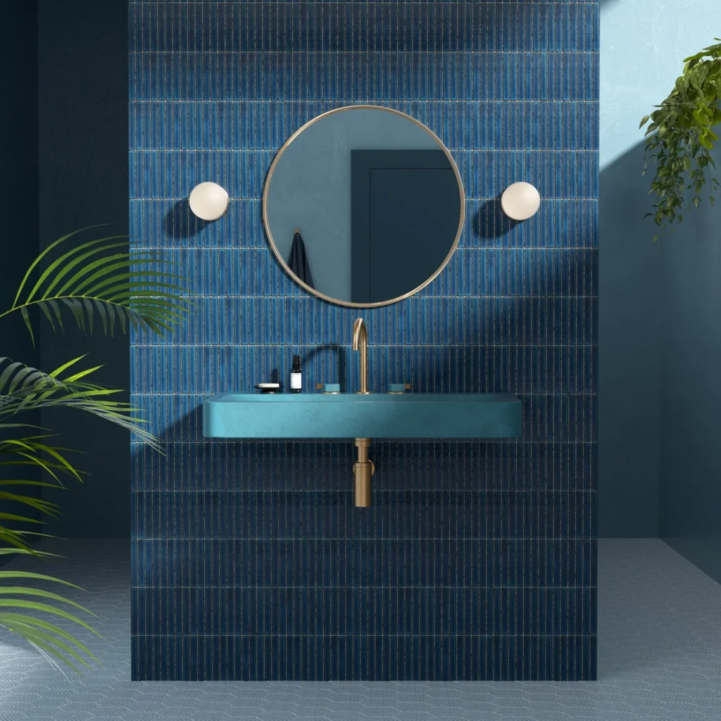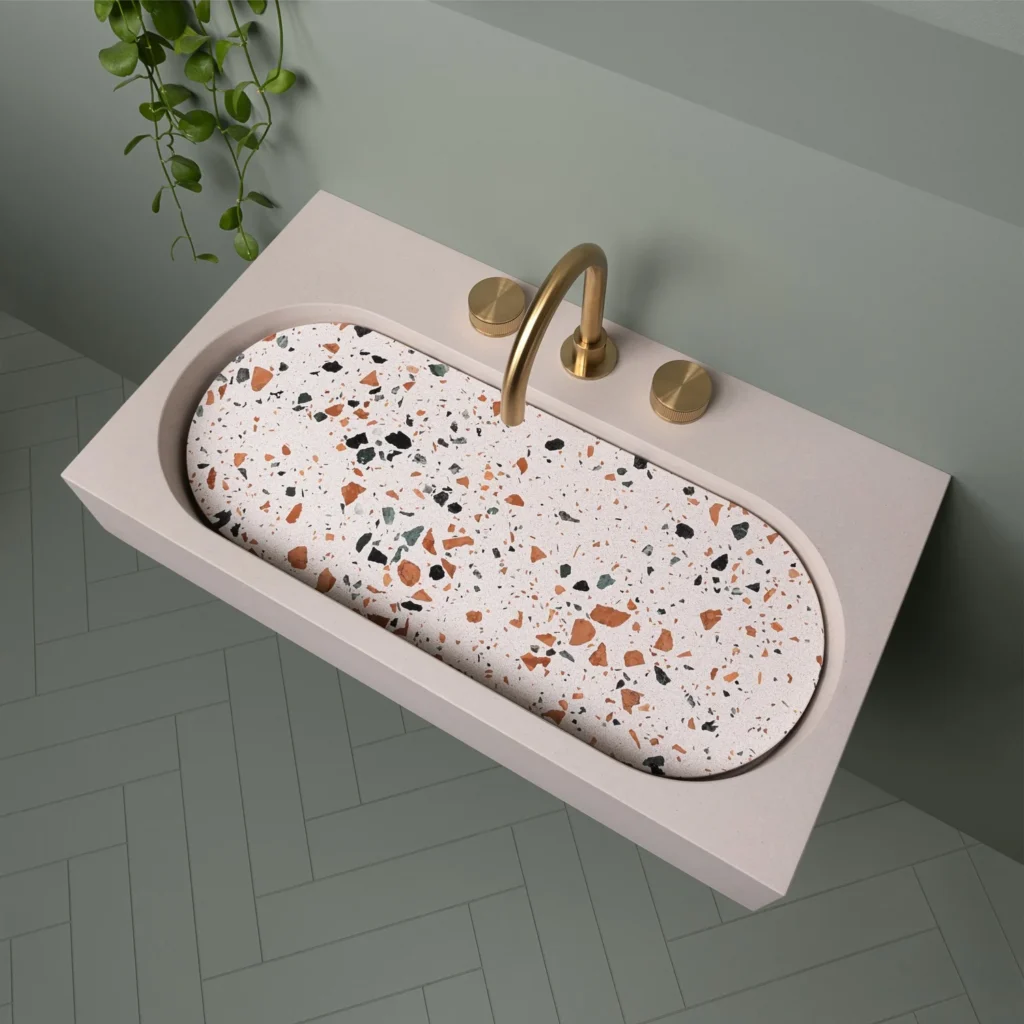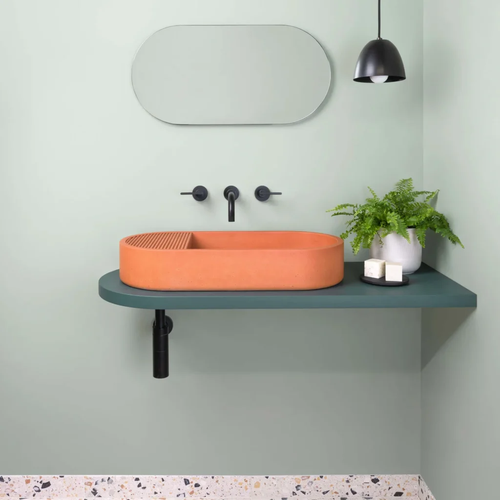 Schlankes rechteckiges Waschbecken mit abgewinkeltem pillenförmigem Einsatz, erhältlich in gemischten oder abgestimmten Farbkombinationen. Für Wand- oder Oberflächenmontage geeignet, Wandhalterungen inklusive. Konzipiert für Aufsatz- oder wandmontierte Armatur, kompatibel mit allen Standard-Abläufen.