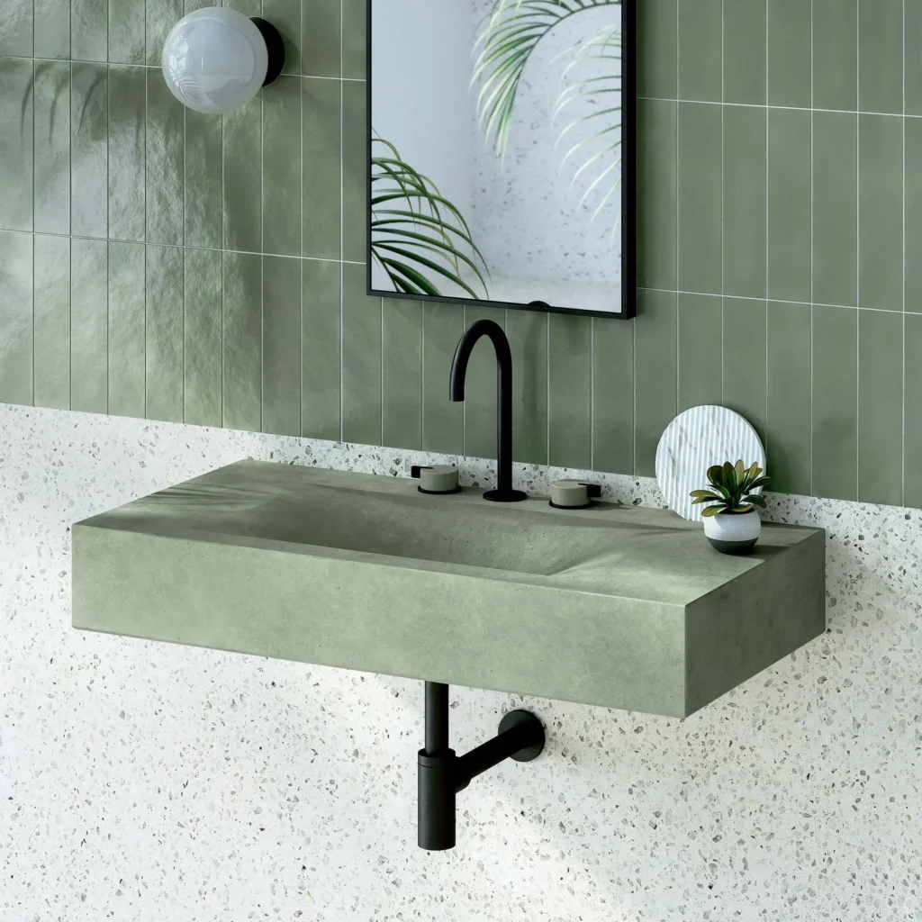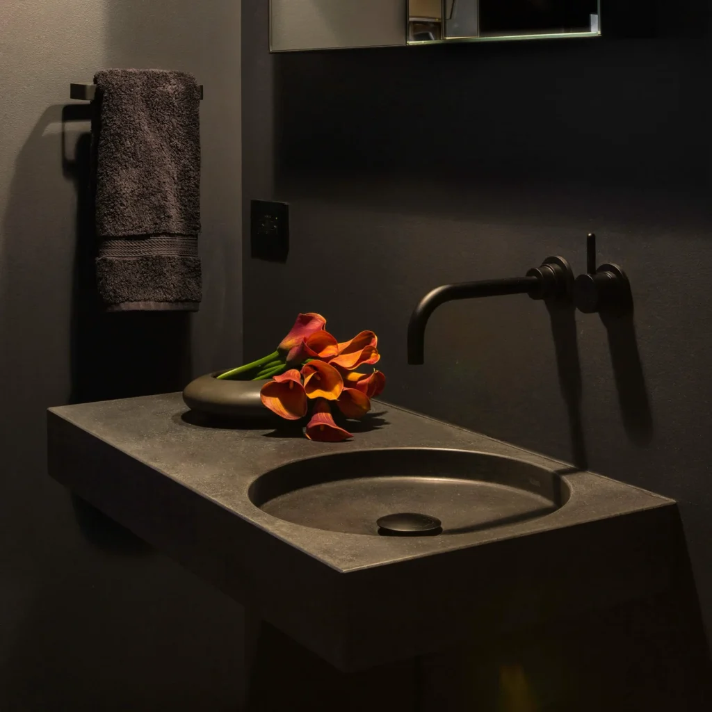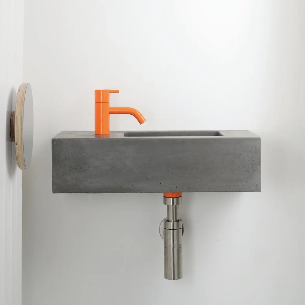 Markantes Waschbecken mit integrierter Spritzschutzwand, die die organischen Eigenschaften von Beton betont. In mehreren Größen erhältlich, für Wand- oder Oberflächenmontage geeignet. Wandhalterungen inklusive, konzipiert für wandmontierte Armatur, kompatibel mit allen Standard-Abläufen.