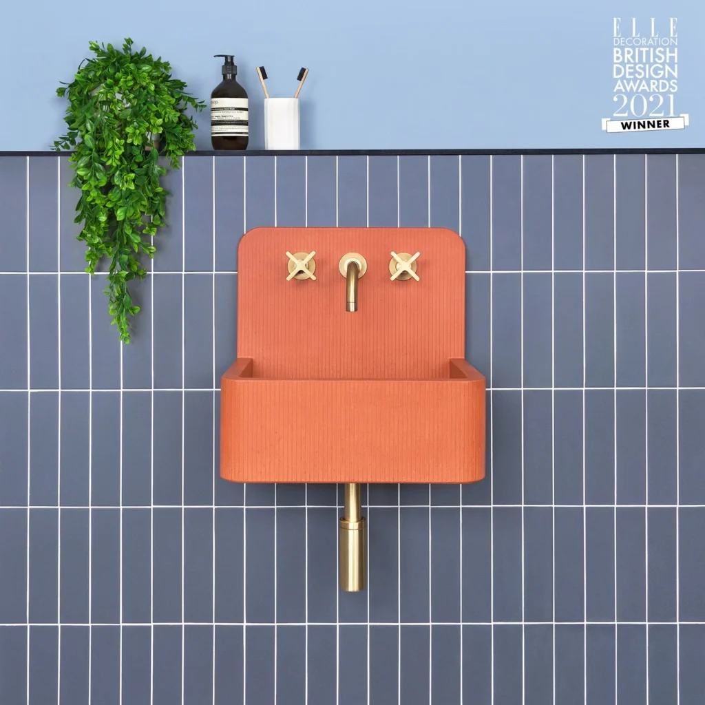 Raffiniertes Waschbecken mit gerippter Textur, tiefem Becken und versenktem Ablagebereich, ADA-konform. Für Wand- oder Oberflächenmontage geeignet. In 28 Farben erhältlich, hergestellt in Großbritannien.