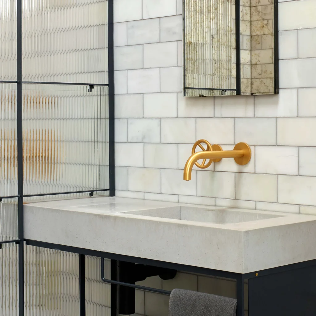 Ableitung der Elm-Serie mit gewölbter integrierter Spritzschutzwand, die das Waschbecken spiegelt. Das zarte gerippte Oberflächenmuster verstärkt die Form durch subtiles Spiel von Licht und Schatten. Für Wand- oder Oberflächenmontage geeignet.