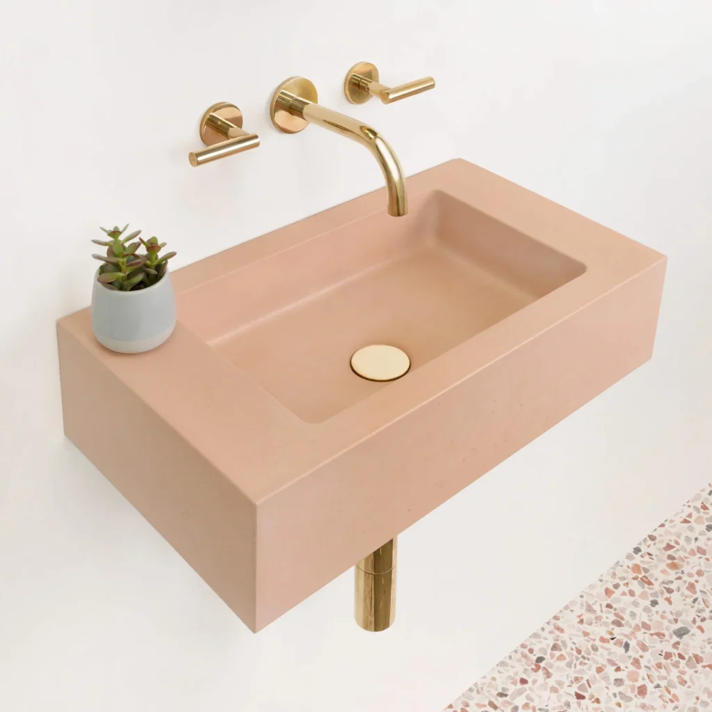 Kompaktes rechteckiges Waschbecken mit seitlichem Ablagebereich und optionalem oberflächenmontiertem Hahnloch. Platzsparende Lösung für kleine Badezimmer, Gästetoiletten und En-Suites. Für Wand- oder Oberflächenmontage geeignet, Wandhalterungen und maßgefertigte Ständer verfügbar.