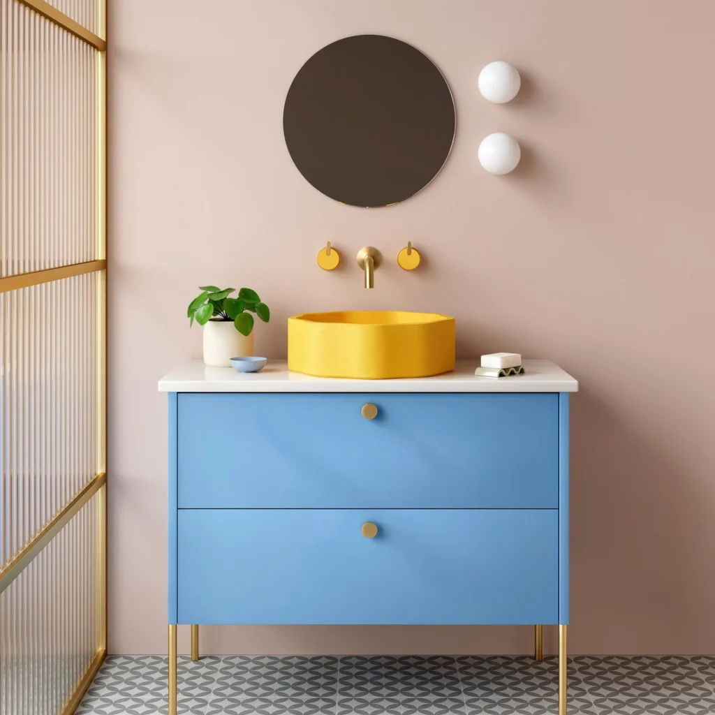 Verspielt praktisches rundes Aufsatzwaschbecken mit organischer Form und weichen gewellten Rändern, Wave Collection, betont spielerischen Optimismus. In 28 Farben erhältlich, hergestellt in Großbritannien.