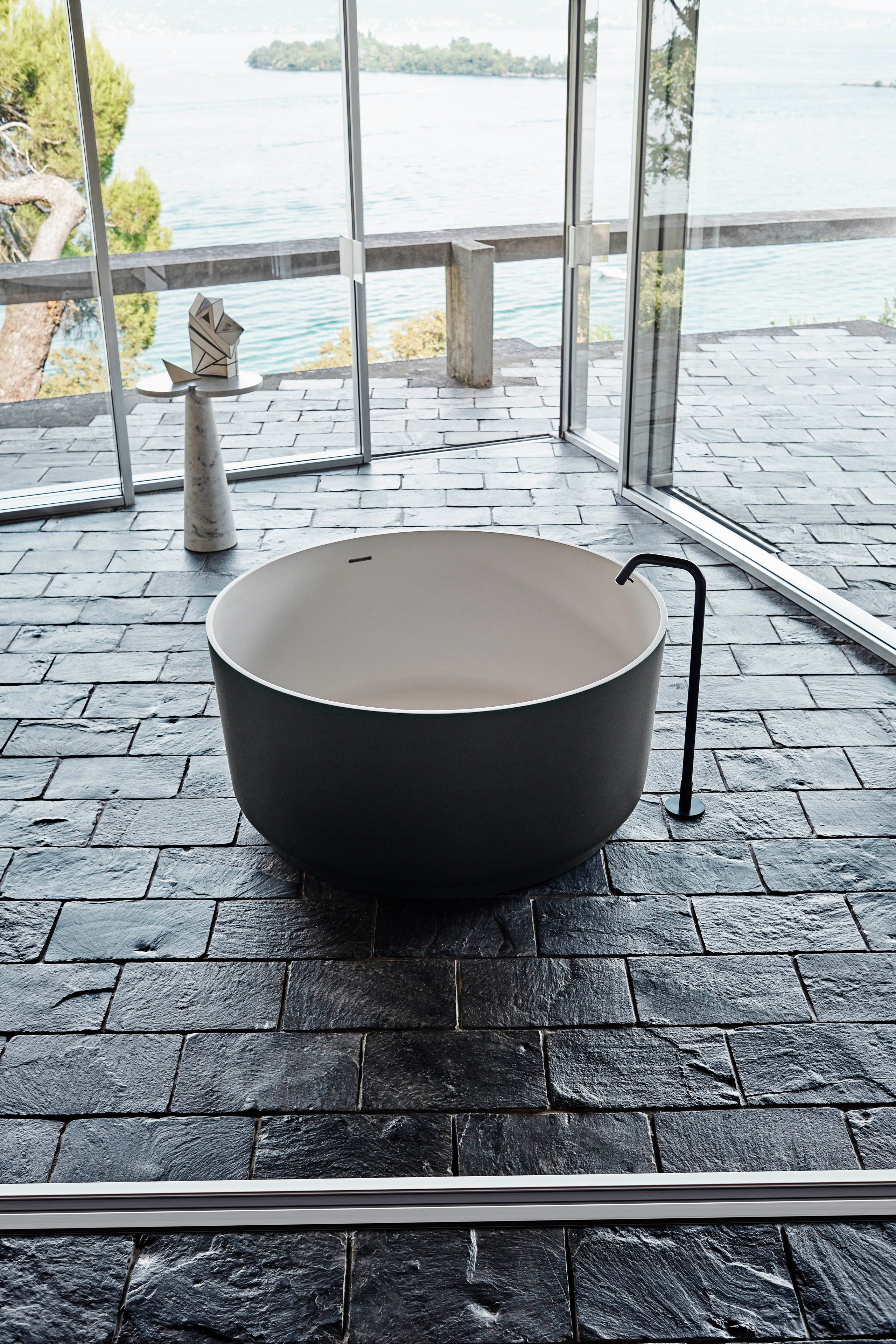 Großzügige freistehende Sitz-Badewanne geeignet für mehrere Personen. Dieses wunderschön designte Schmuckstück kann gut mit freistehenden oder auch an der Wand montierten Armaturen kombiniert werden und ist damit ein außergewöhnlicher Eye-Catcher.