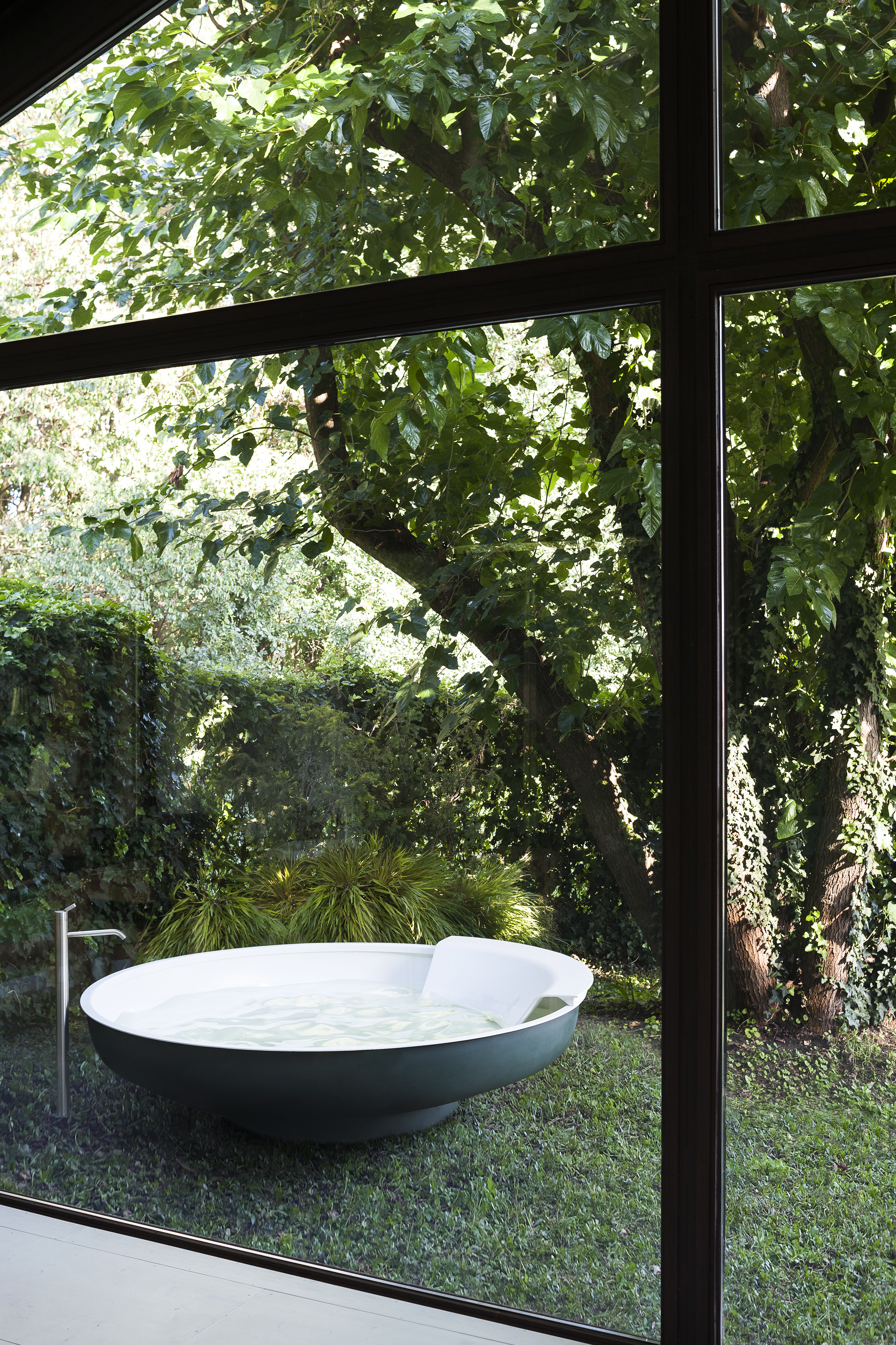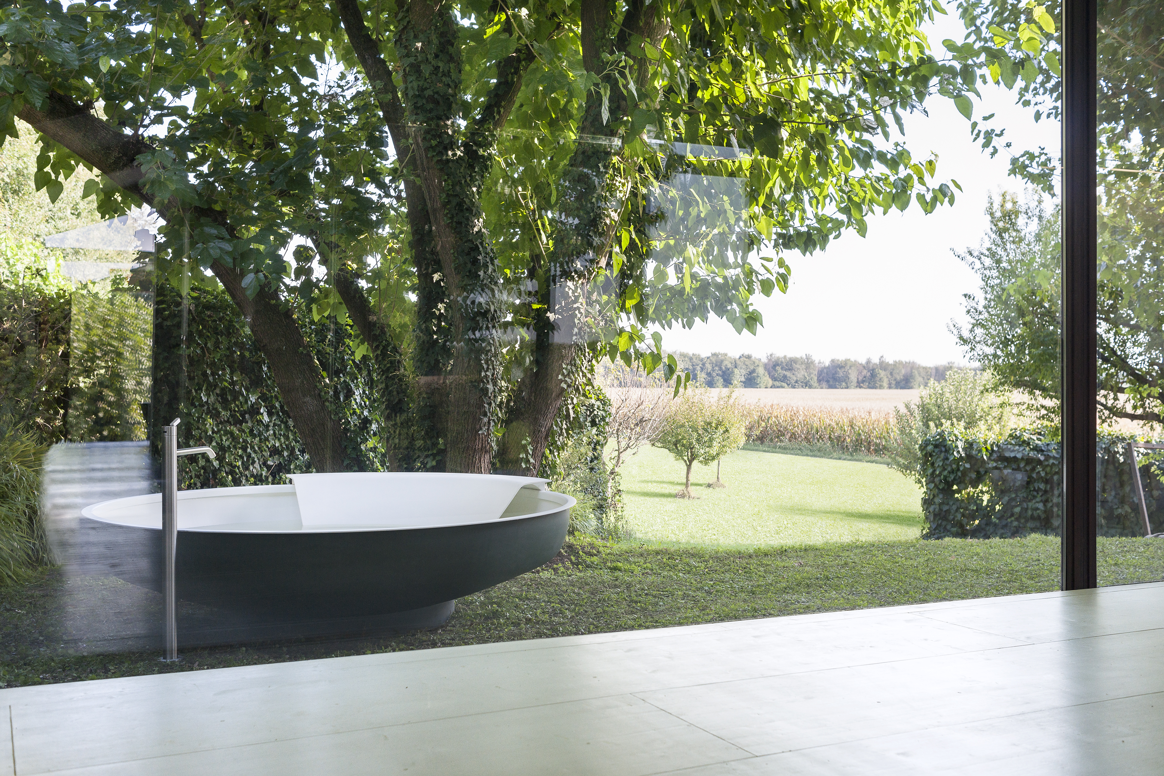 Riesige freistehende Outdoor-Badewanne aus Edelstahl und Rückenstütze aus Cristalplant® mit Überlauf. Diese runde Designerbadewanne ist innen weiß und außen dunkelgrau und kann sehr gut mit freistehenden oder auch an der Wand montierten Armaturen kombiniert werden