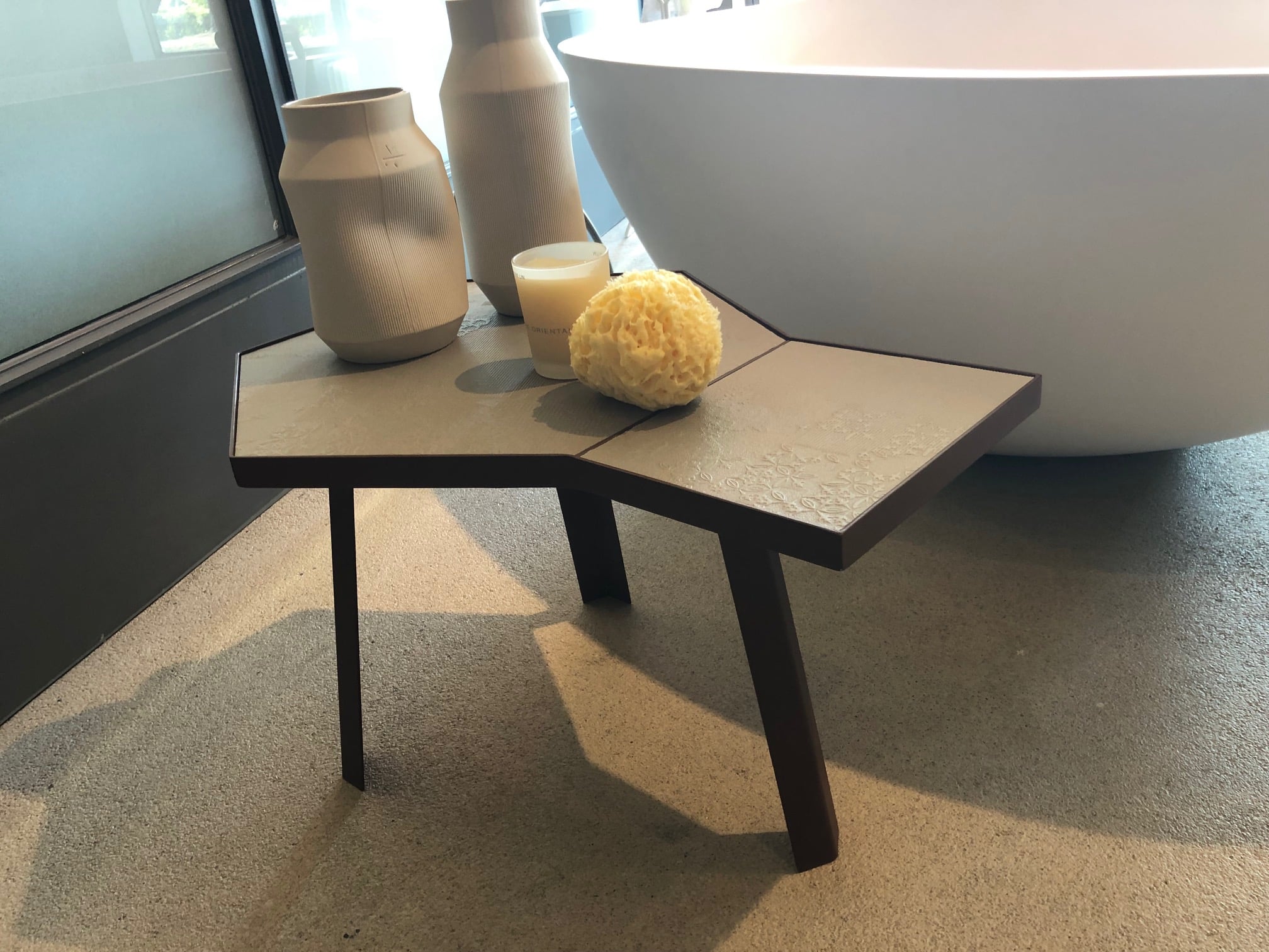 Beistelltisch mit rostbraunem Stahlgestell und Flieseneinlegeplatten