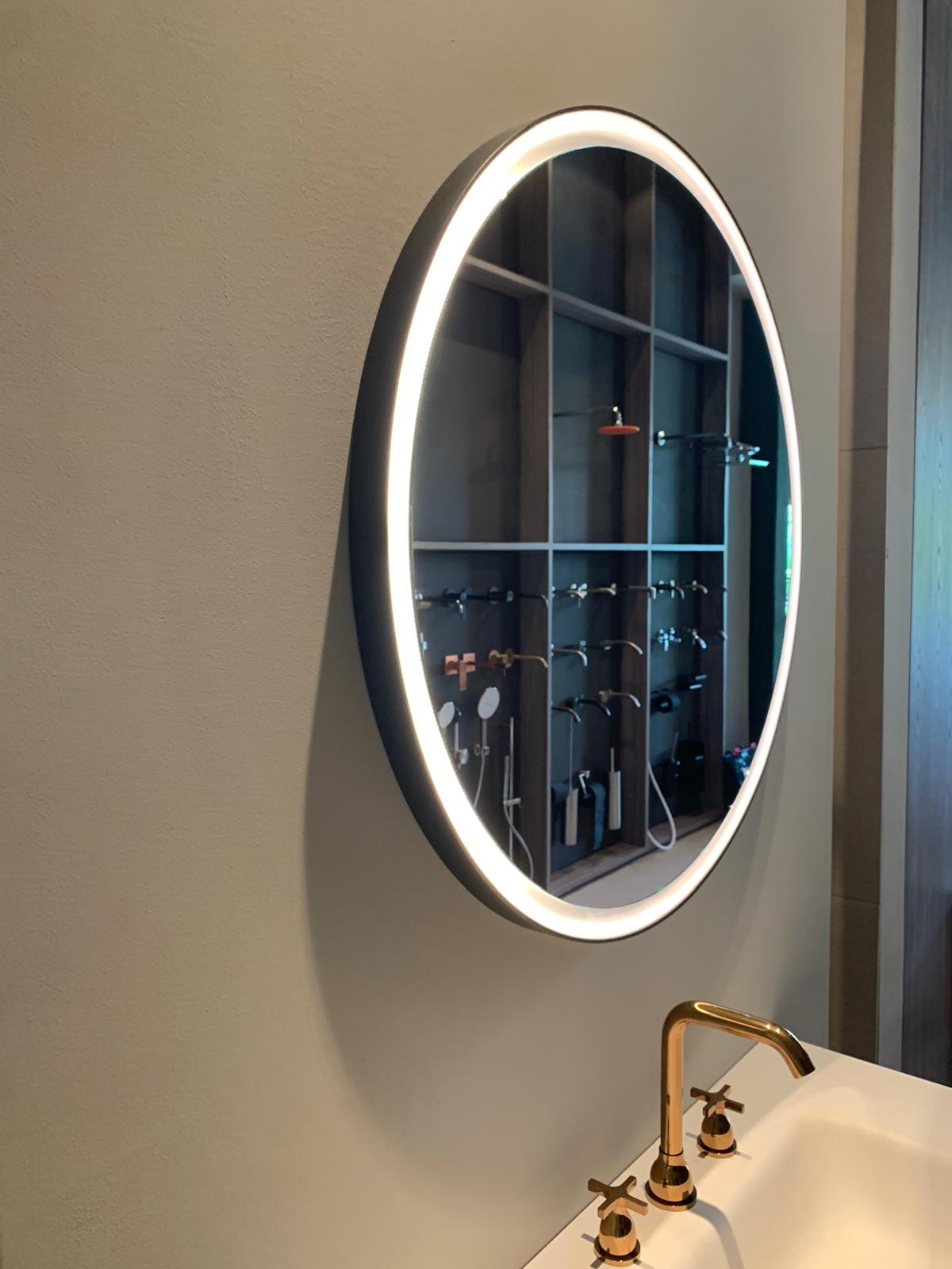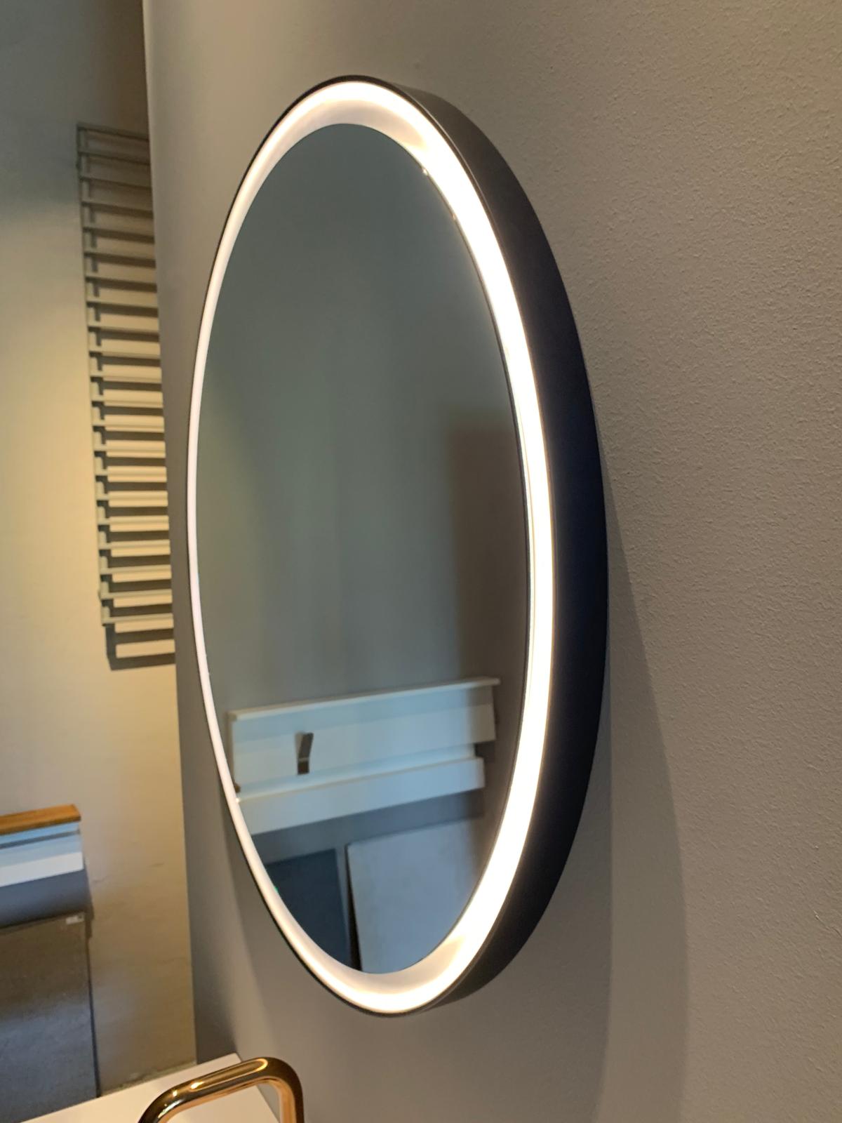 Spiegel mit schwarz lackiertem Rahmen mit interner LED-Beleuchtung. Der Spiegel wird mit Schrauben und Spreizdübeln an der Wand befestigt.