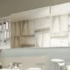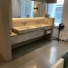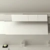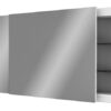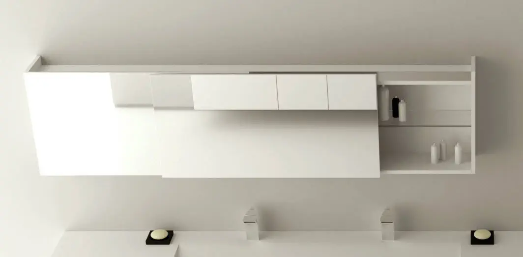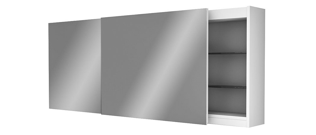 Horizontaler rechteckiger Spiegelschrank mit koplanaren Schiebetüren und Glasablagen.