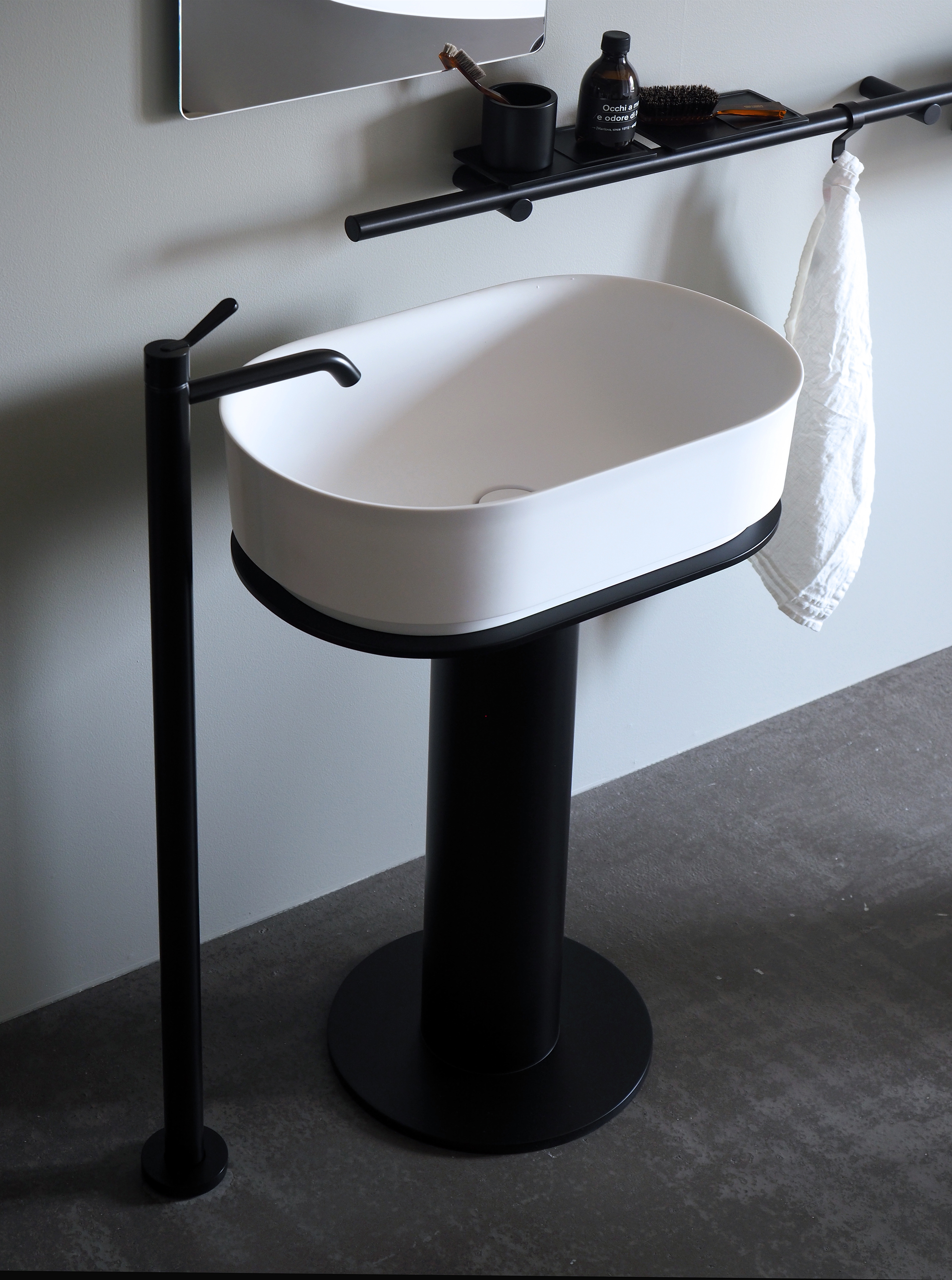 Mattschwarz lackierter Ständer aus Metall. Passt zu Waschbecken Immersion ACER0708P. Als wandmontierte Version oder mit Bodenabfluss erhältlich.
